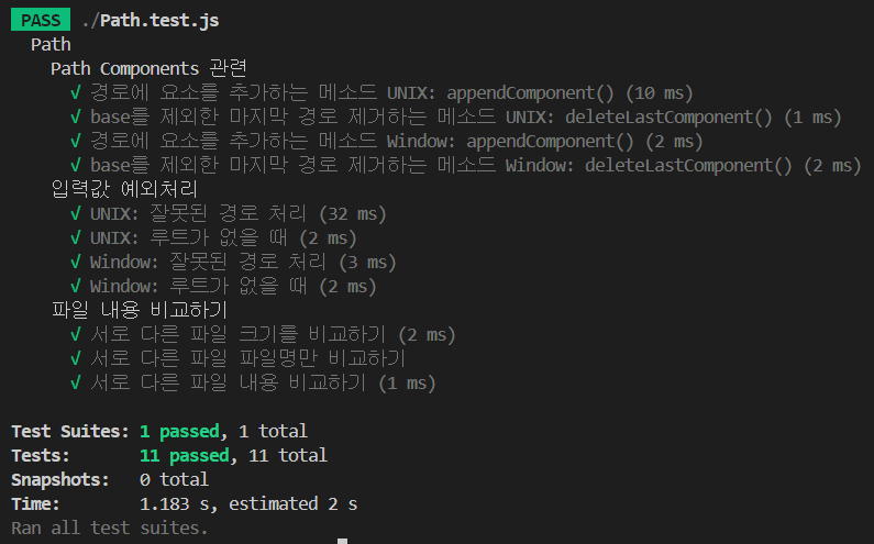 테스트 파일로 인해 어떤 테스트케이스가 통과되었고 어떤 테이스케이스가 반려되었으며 런타임은 얼마나 걸리는지까지 전부 확인가능