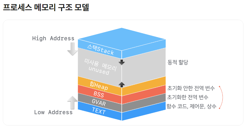 일반적인 프로세스 메모리 모델은 프로그램이 실행되는 동안 사용하는 메모리의 구조